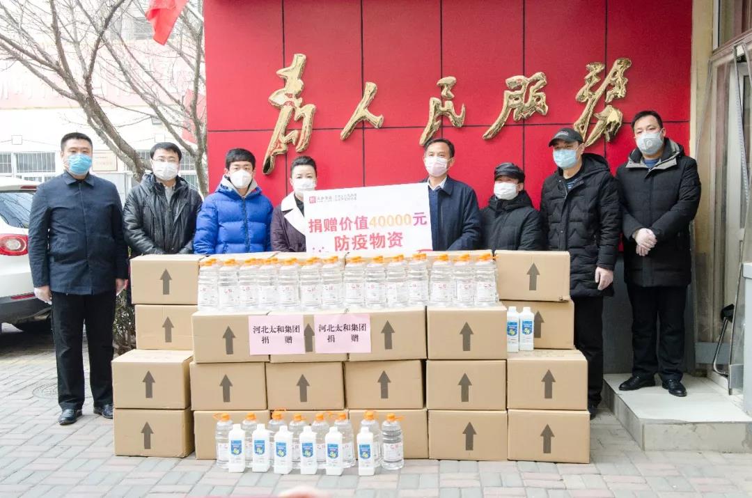 长安区人大常委、中国四会玉器博览城总经理陈暇,太和文化礼品城常务副总经理尚林,太和百货日化城常务副总经理国朋军带领部分员工代表向阜康街办事处捐赠了75%酒精36瓶、84消毒液40箱等20000元物资及现金20000元,以实际行动全力支持抗击新型冠状病毒感染的肺炎疫情防控工作。